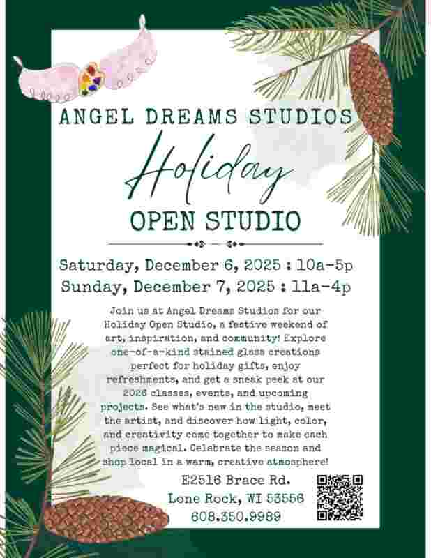 Join us for our Community Art Classes, held Wednesday mornings from 9–11 AM, at Angel Dreams Studios, Lone Rock, WI. These inclusive classes welcome all ages and abilities to create together! Each session includes a brief art history lesson, technique demonstration, and hands-on project. Supplies provided!